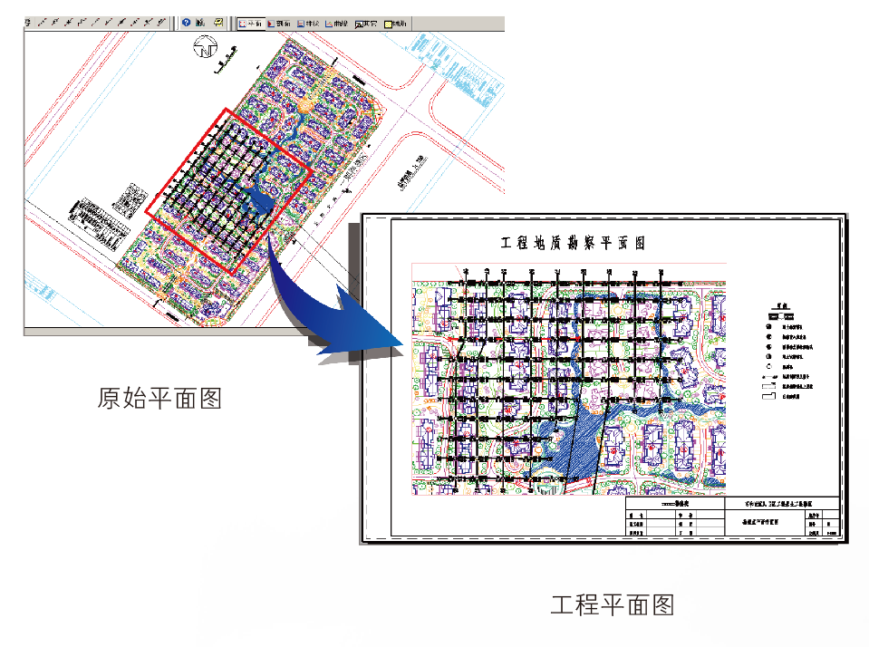 1. 平面图增添了更多的地质内容绘制,包括:时代成因、构造、产状、地质界线、其它勘测符号、分区编号等。提供工程中常用的组合钻孔、平面图局部切图、地下水等高线、剖面线切地面线等功能。