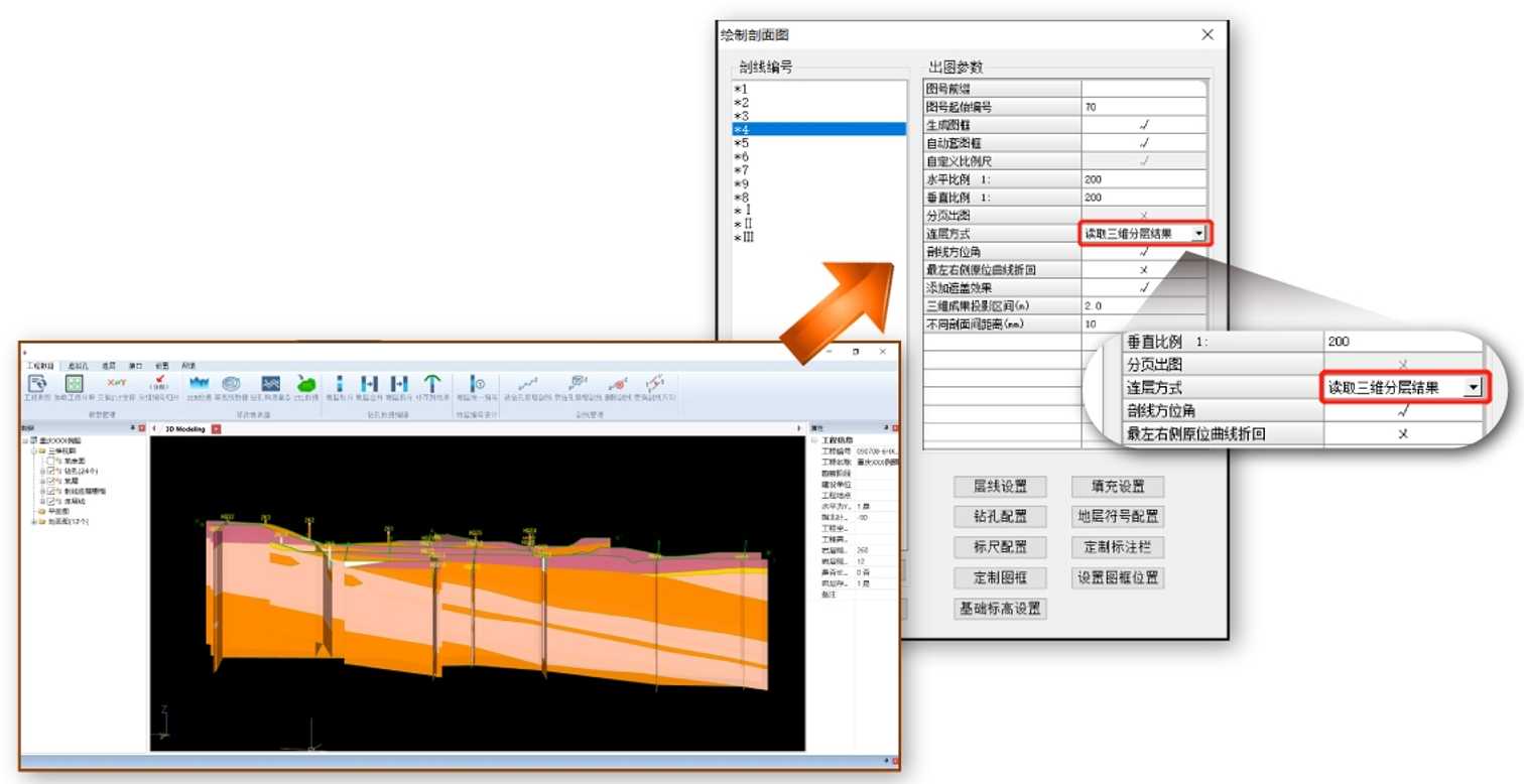 1. 平面图布置的地质构造等地质填绘、钻孔、剖线等,入库后可以在分幅、旋转后的平面图上重新生成。剖面手工绘制连层信息后,可以入库。实现图形和数据联动。