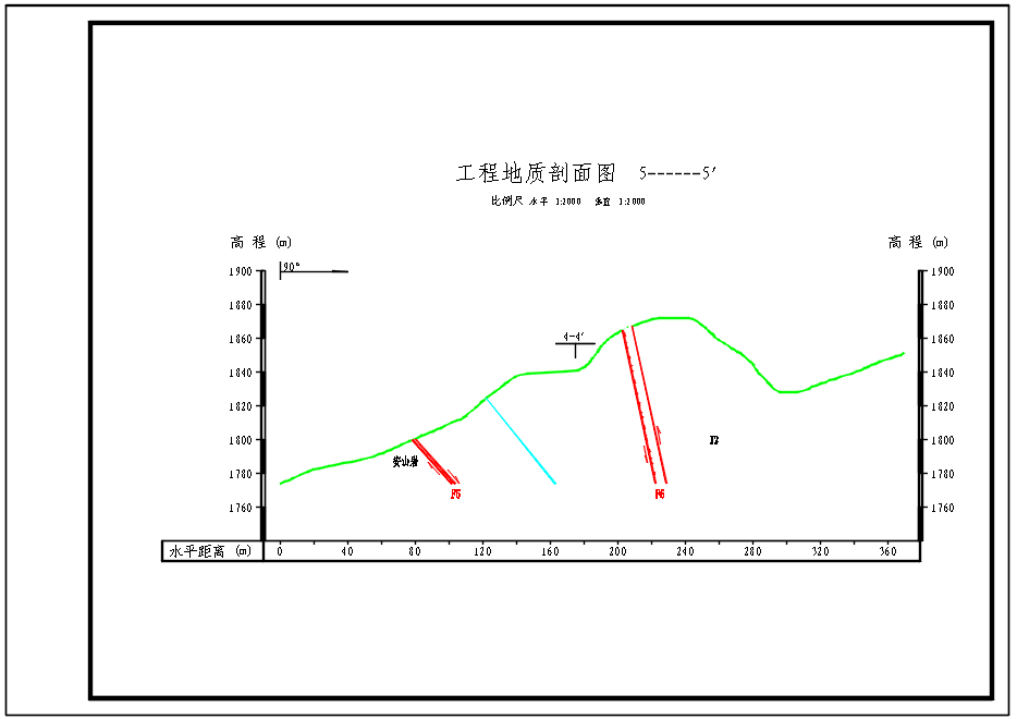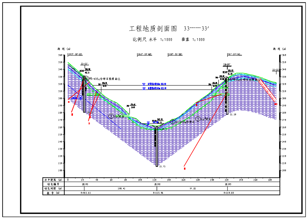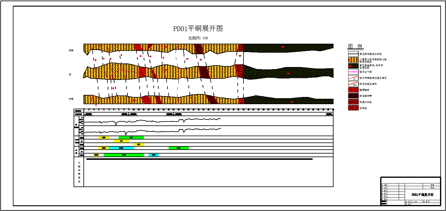 ■可按照水利水电制图的标准要求,自动生成剖面图。并且可以自动绘制地质构造中各类要素,包括断层、节理、裂隙、节理密集带、岩层露头线、覆盖层线。同时可自动标注岩芯获得率、RQD、透水率或渗透系数、河水位、蓄水位、平硐、探坑探槽等,使得剖面图的信息更为丰富和全面。