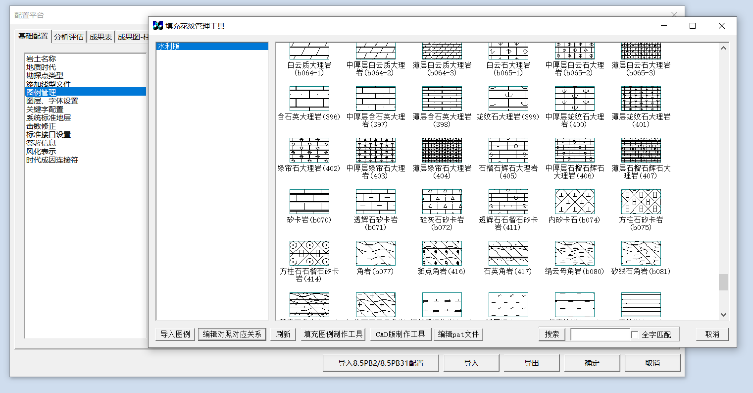 ■标准的岩土分类及图例,按照《水利水电工程制图标准》制作了500余个图例,完全按照岩土分类的标准显示