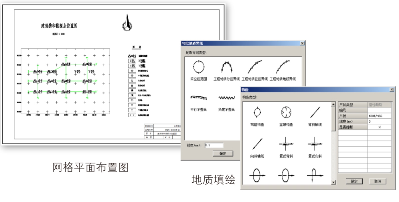 ■3.平面图可以完成电力所有地质填绘(包括:地质构造、地质界线、地貌、不良地质符号、水文地质符号、地质分区编号、地震加速度、手工绘制小柱状图),入库后可以在分幅、旋转后的平面图上重新生成。
