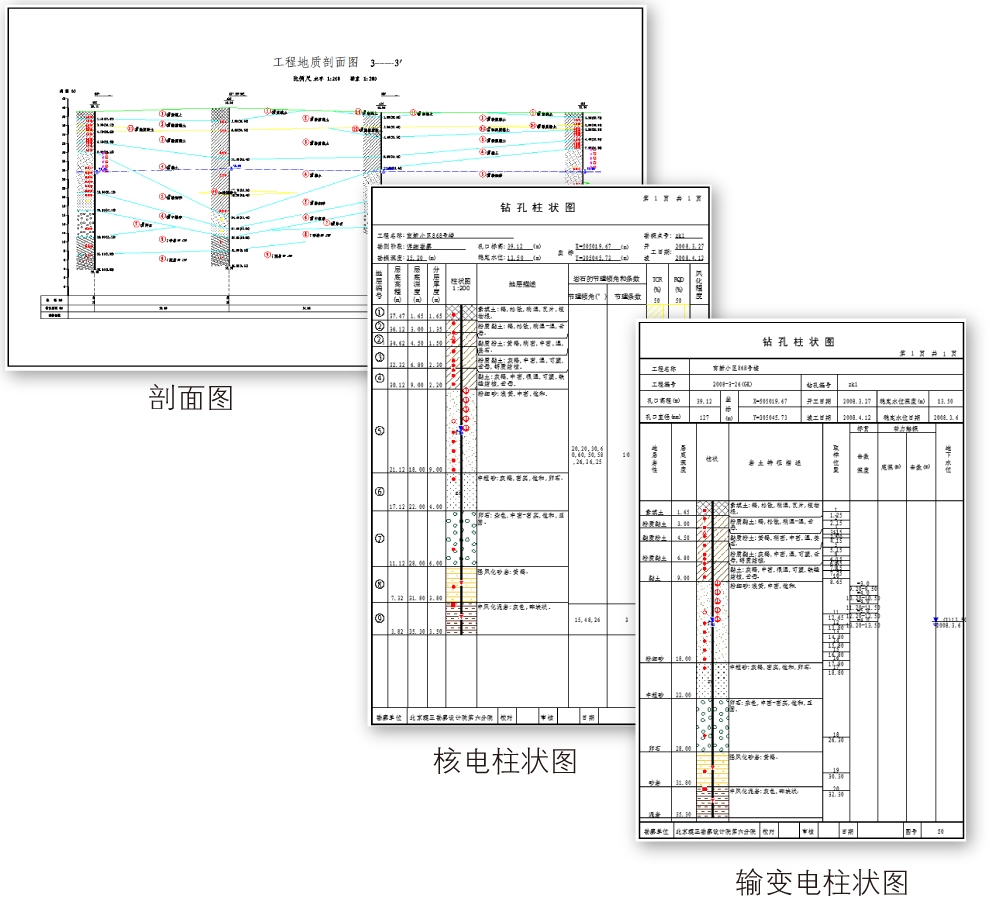 ■按照电力标准,数据转换,自动生成平面图、剖面图、柱状图、室内试验成果表、文字报告等,进行指标统计、液化判别、场地类别划分等分析计算,提供填充图例编辑、文字报告模板等辅助工具。