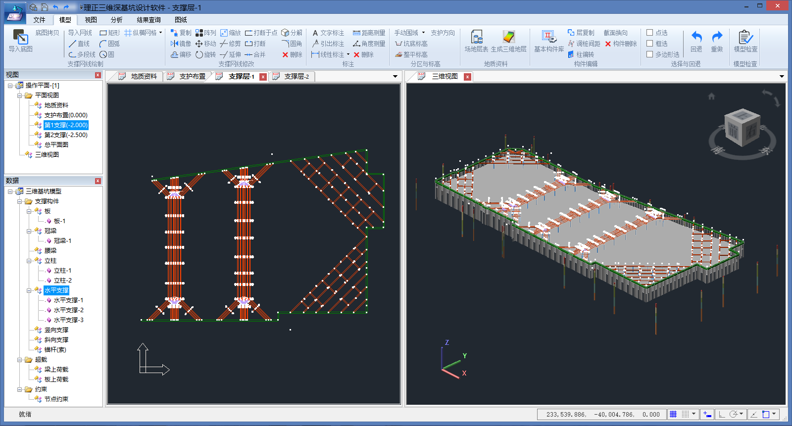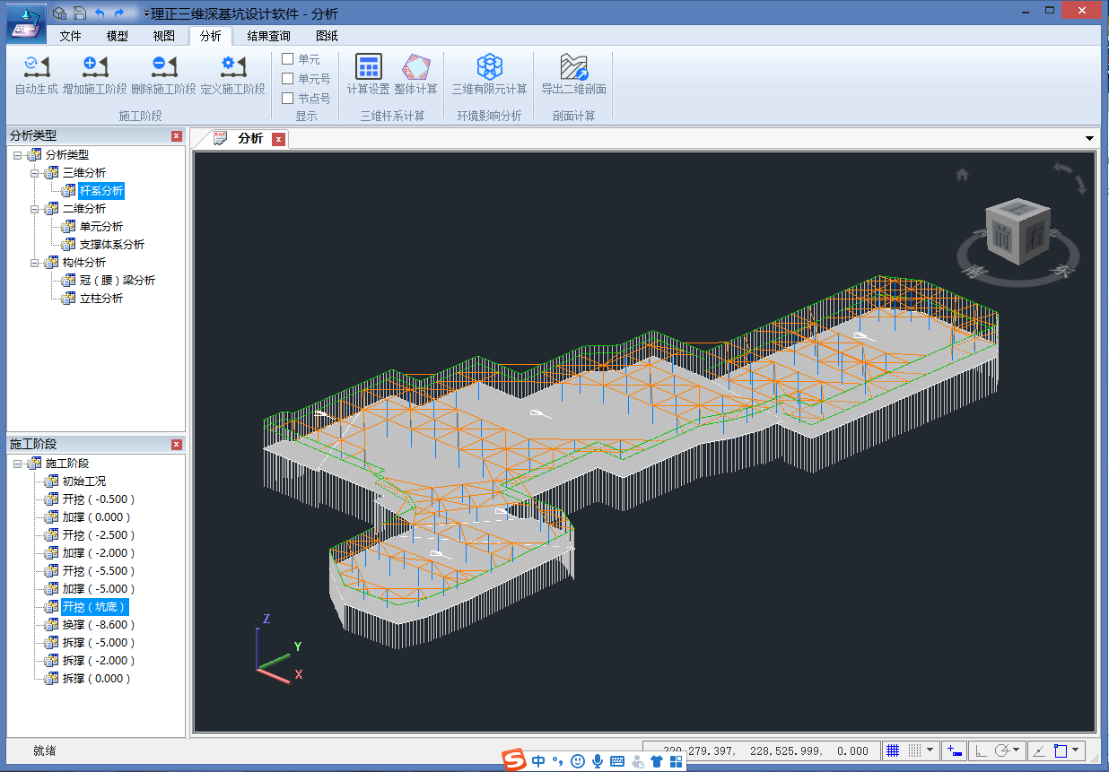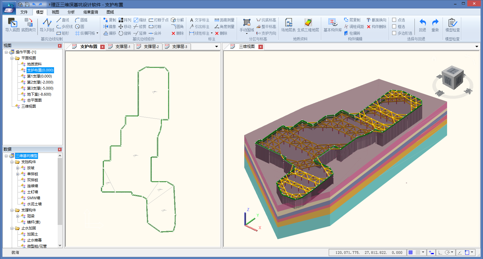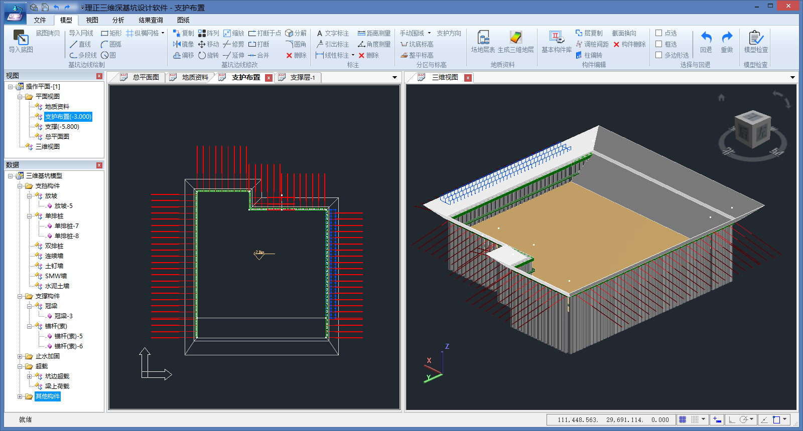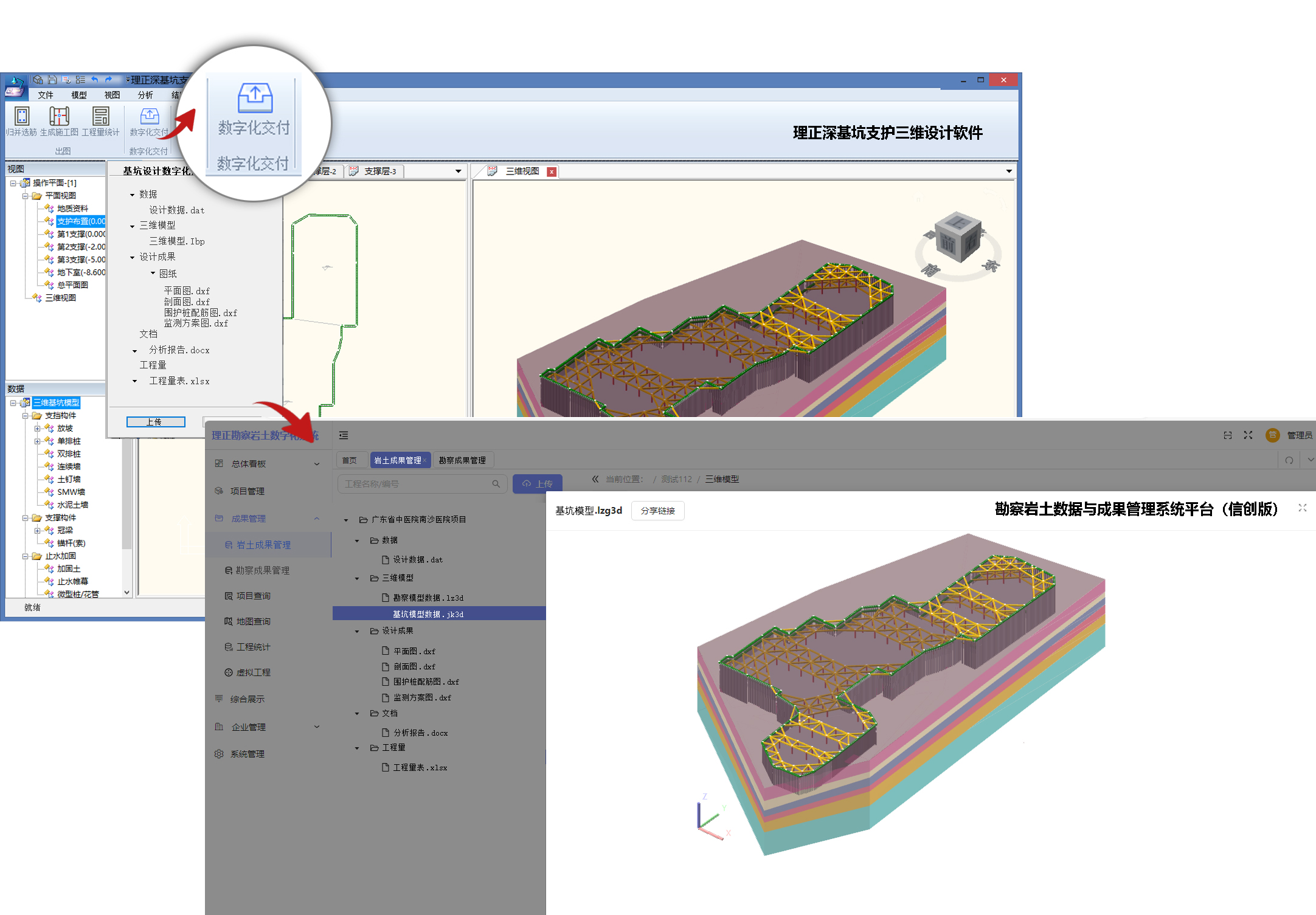 基于正向BIM设计理念,从接入上游三维地质数据,到单元分析与整体分析,最终生成施工图并进行轻量化展示以及最终的数字化成果交付,展现了基坑工程全生命周期的完整设计形态。