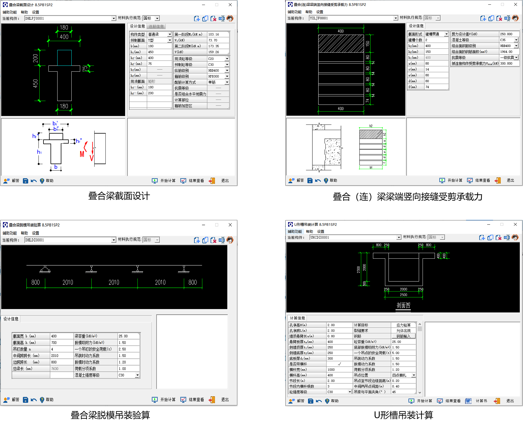 包括脱模吊装内力计算、混凝土法向拉应力及吊钉或桁架筋 强度验算、叠合梁(连梁)梁端竖向接缝校核、预制柱底水平接缝校核、 剪力墙水平接缝校核、单孔箱涵吊装、多孔箱涵吊装、U 形槽吊装、 预制板吊装。