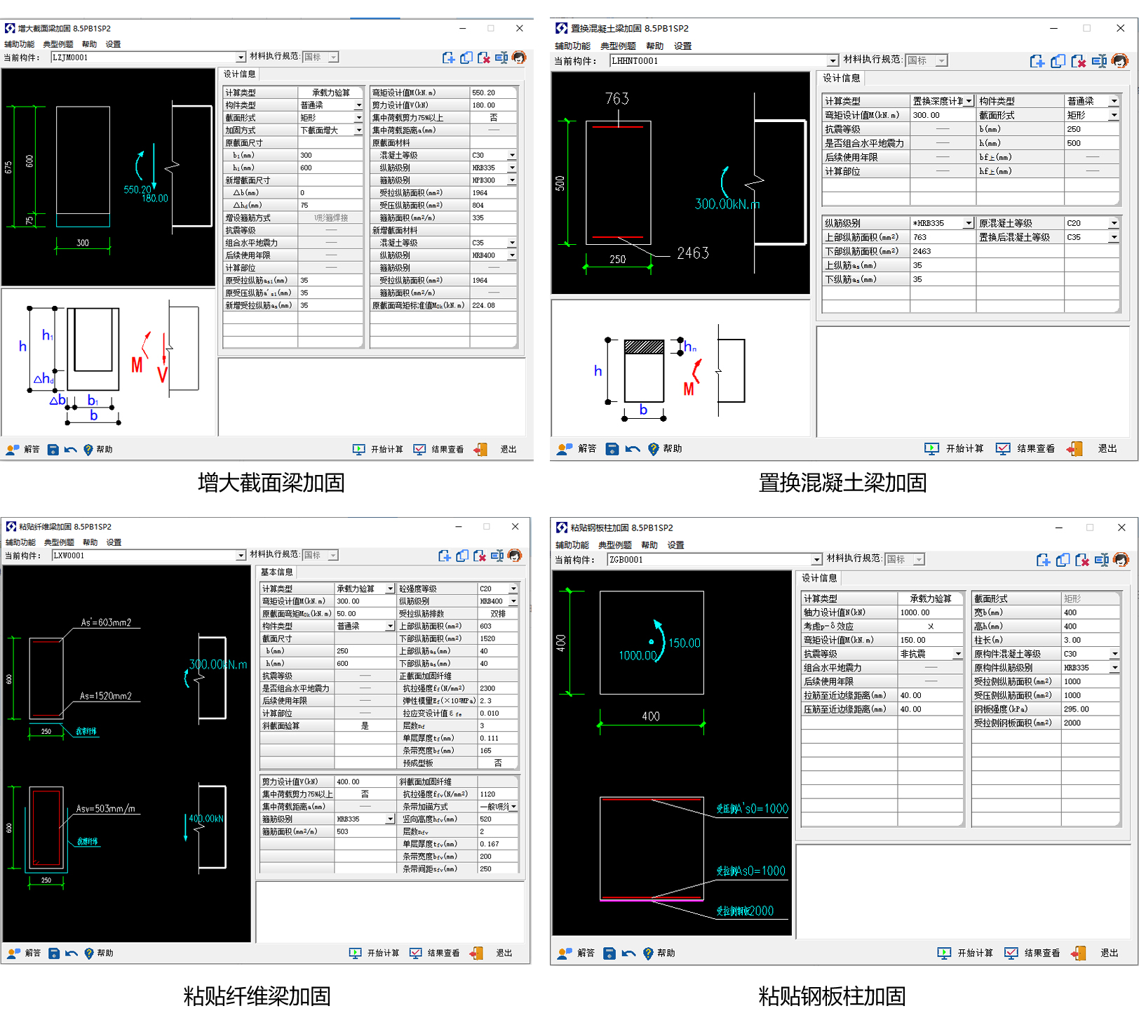 软件介绍:可以完成采用增大截面、置换混凝土、粘贴纤维、粘贴钢板或外包型钢的梁板柱构件的加固,植筋加固、 锚栓加固的设计或验算。