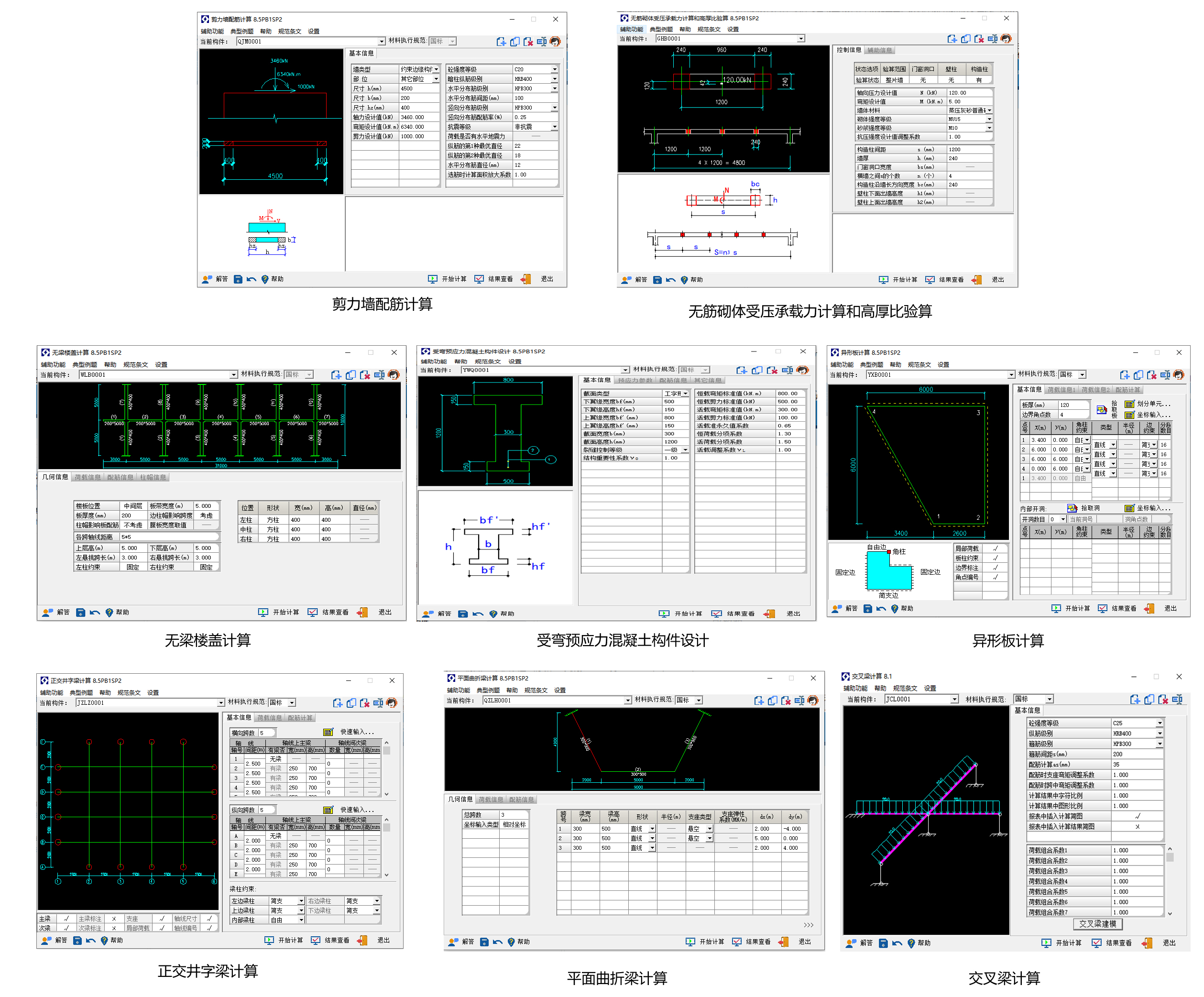 适用于钢筋混凝土梁截面计算、柱截面计算、墙截面计算、深梁计算、牛腿计算、预埋件计算、内折角计算、连续梁计算、裂缝计算、挠度计算、异形柱截面、柱配筋校核、混凝土局压验算、箱形梁、素混凝土计算、单块矩形板计算、受冲切承载力计算、柱加密区箍筋及体积配箍率计算、地下室外墙计算、移动荷载受力分析、板节点弯矩调整、附加横向钢筋计算、现浇混凝土空心楼盖截面、剪力墙稳定验算等项设计工作。