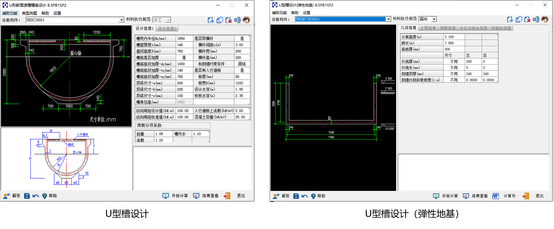 软件介绍:U 形槽荷载及荷载组合计算、 地基承载力计算、抗浮计算、内力计算(按杆系有限元计算,底板计 算可按弹性地基梁考虑)、配筋、裂缝计算等。