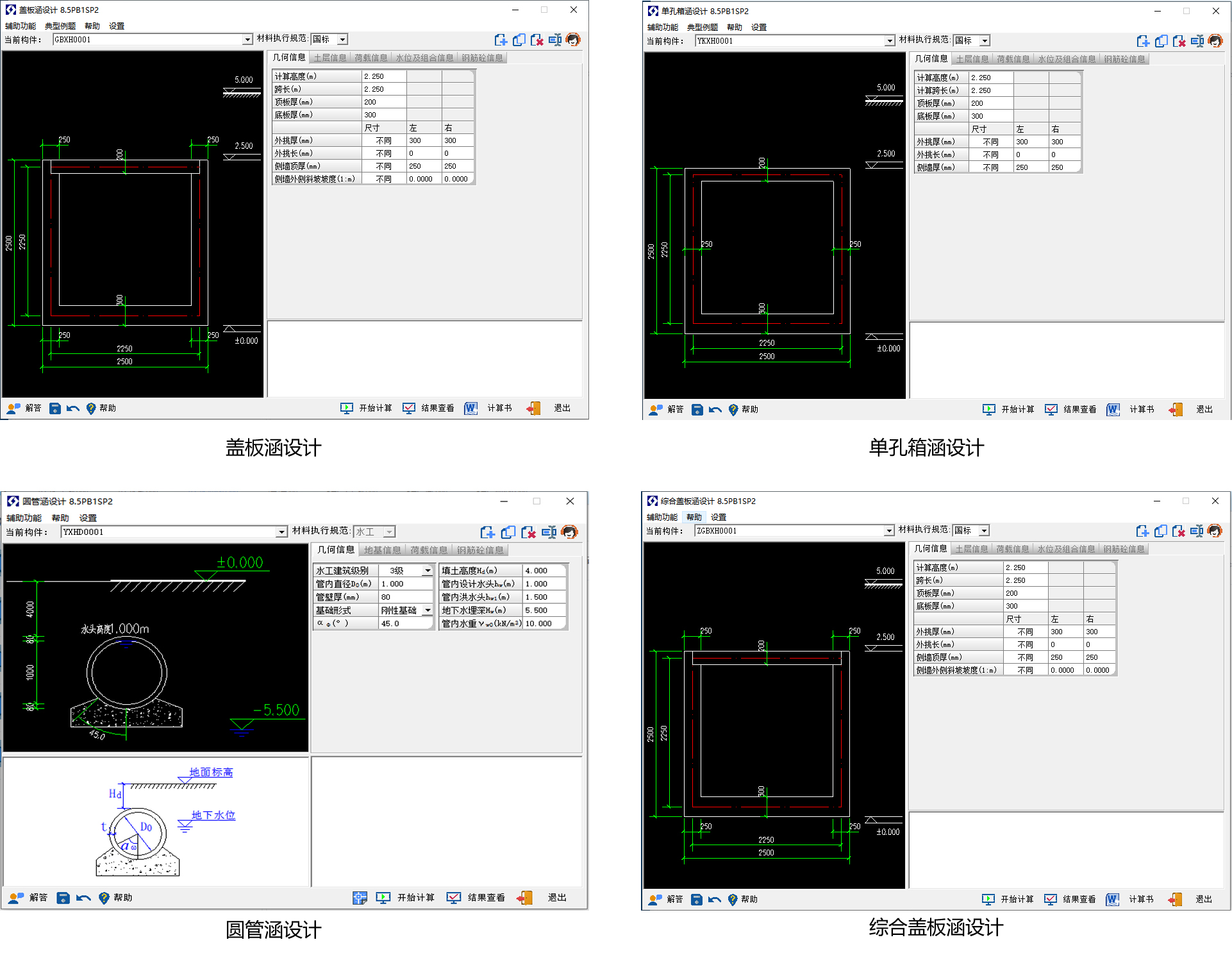 适用于市政、道桥、水利、电力等行业的单孔/多孔箱涵、单孔/多孔盖板箱涵、单孔/多孔/多层地下通道、圆拱涵、综合涵、过路管涵计算,