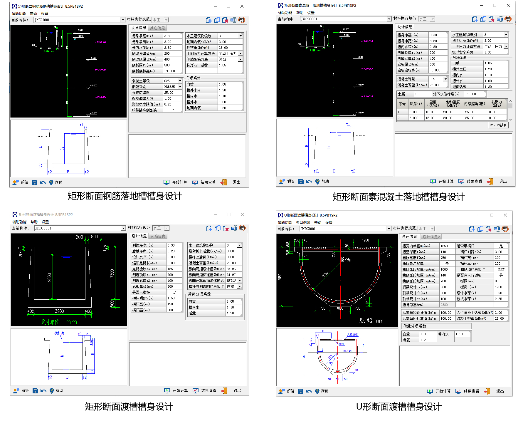 主要计算内容包括槽身横向荷载及组合、内力、配筋 及裂缝计算,纵向配筋、裂缝计算等,落地槽支持素混凝土与钢筋混 凝土计算,主要计算内容荷载及组合、地基承载力、抗浮、内力、配 筋、裂缝等(素混凝土落地槽进行槽身厚度验算)。