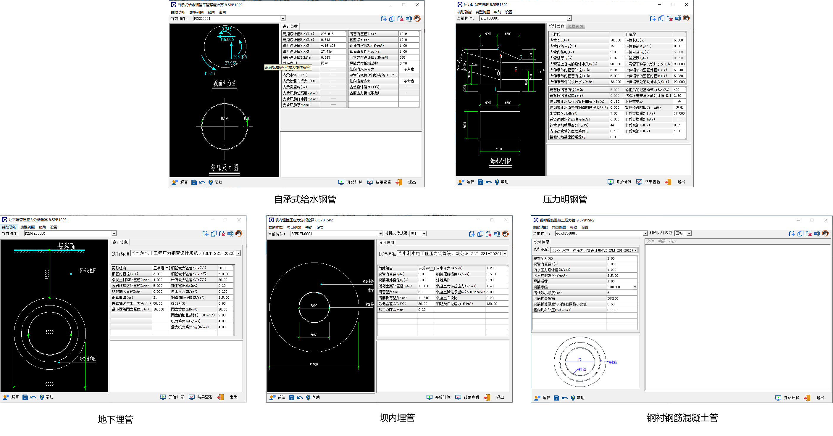 软件介绍:可完成压力明钢管镇墩、压力明钢管支墩、压力明钢管应力、压力明 钢管振动、压力明钢管抗外压稳定、压力明钢管支承环应力、露天式 压力钢管伸缩节、自承式给水钢管平管强度、自承式给水钢管折管强 度、自承式给水钢管拱管强度、自承式给水钢管平管稳定、自承式给 水钢管折管稳定、自承式给水钢管拱管稳定、自承式给水钢管平管设 计、自承式给水钢管折管设计、自承式给水钢管拱管设计、调压井设 计、坝内埋管压应力分析、地下埋管压应力分析、地下埋管抗外压稳 定的计算。