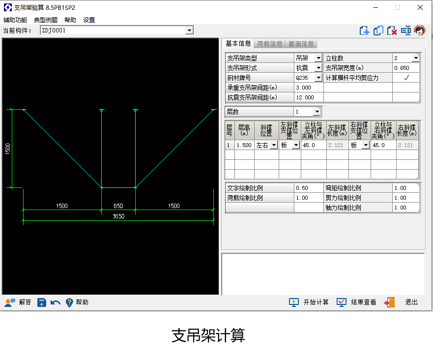 软件介绍:包括吊架、支架、壁挂式; 支吊架形式有抗震支吊架和重力式支吊架; 设计内容包含杆件(横杆、斜杆及立柱)内力计算、杆件强度及稳定 验算;还可以绘制施工图。地震作用计算规范支持《建筑机电工程抗 震设计规范》(GB 50981-2014)和《通信设备安装工程抗震设计标 准》(GBT 51369-2019)。