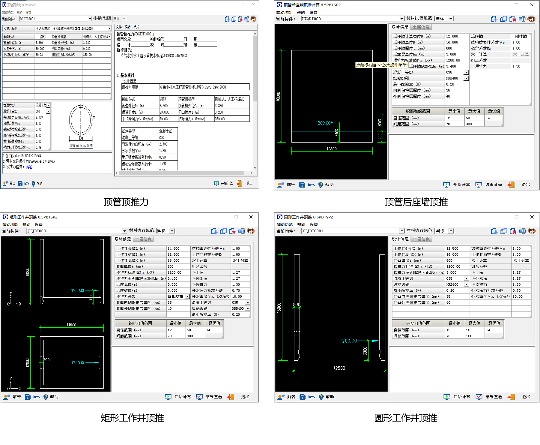 软件介绍:适用于各类顶管工程设计,包括顶管顶推力、顶管后座墙顶推、圆形 矩形工作井顶推计算等模块。