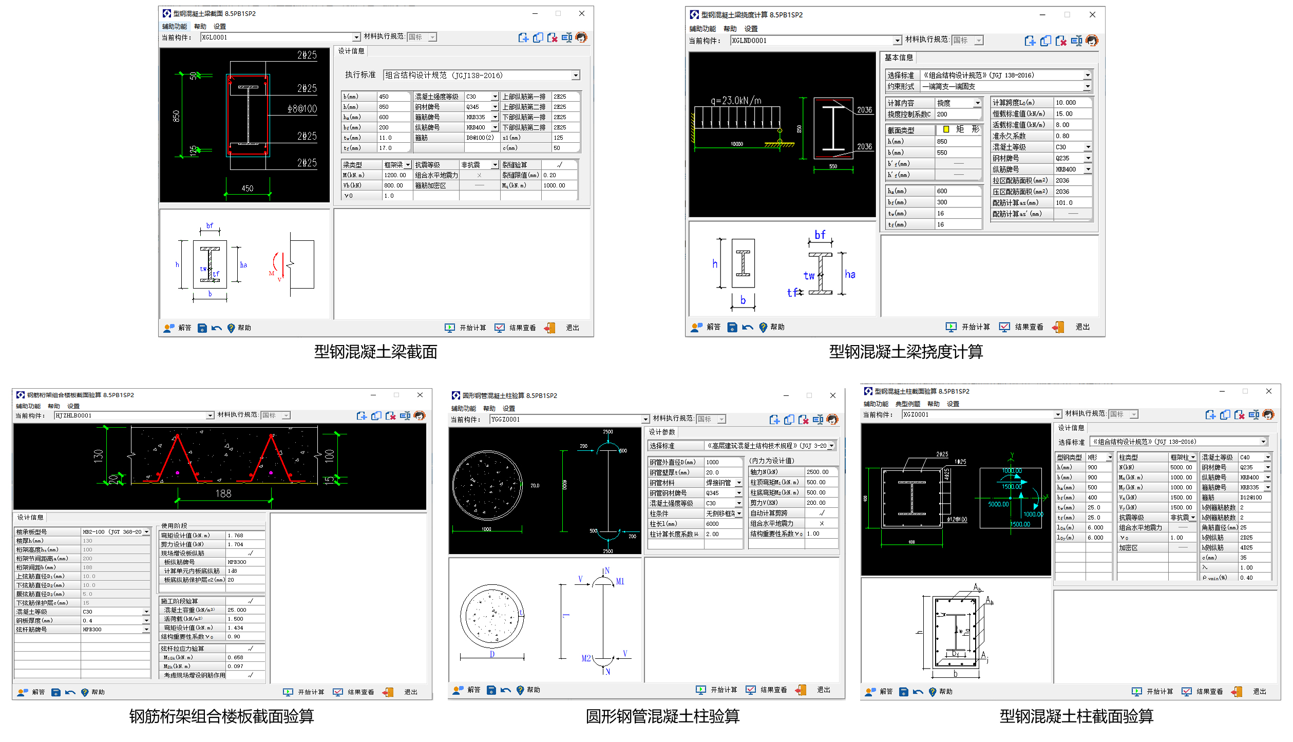 适用于圆形钢管混凝土柱截面、圆形钢管混凝土柱局压、空心钢管混凝土柱截面、矩形钢管混凝土柱截面、型钢混凝土柱截面验算。
