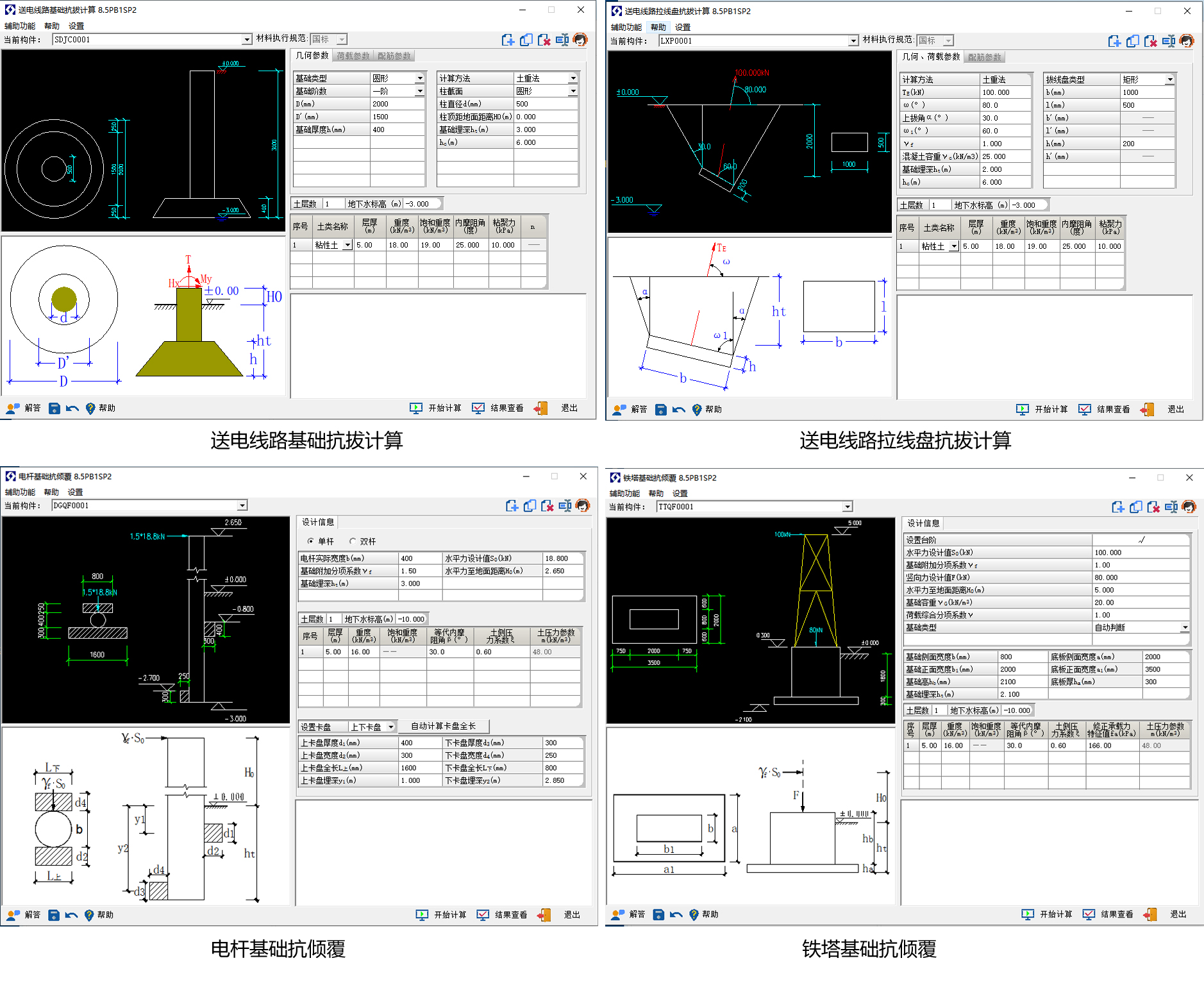 可完成送电线路基础抗拔、送电线路拉线盘抗拔、电杆基础抗倾覆验 算、铁塔基础抗倾覆验算。