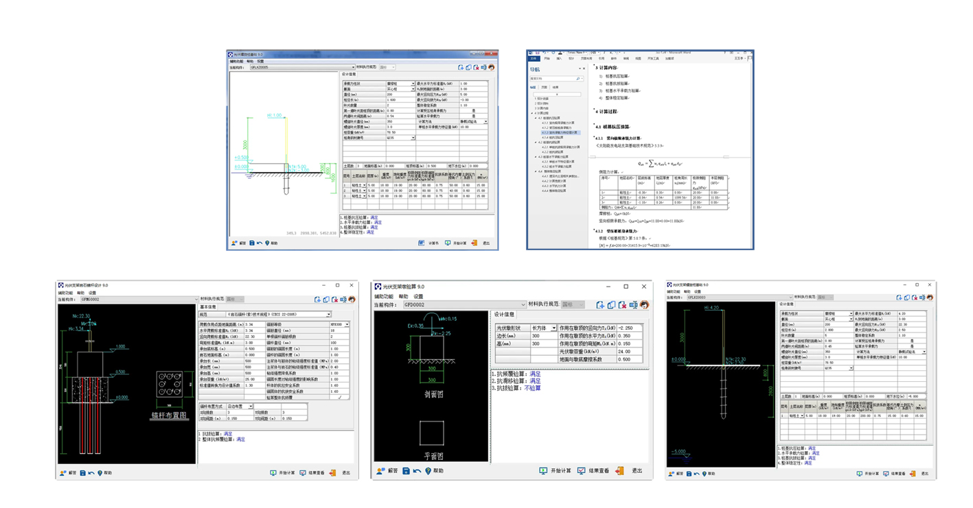 软件专门针对光伏支架基础结构设计,依据现行规范标准的要求,包括光伏等截面微型桩基础模块、光伏墩验算、光伏螺旋桩基础、光伏岩石锚杆设计模块,采用参数化建模,图形联动,易学易用,并提供详细的构件设计验算过程及计算书输出,支持AutoCAD、中望CAD及浩辰CAD绘图软件,提升了结构设计师的工作效率。
