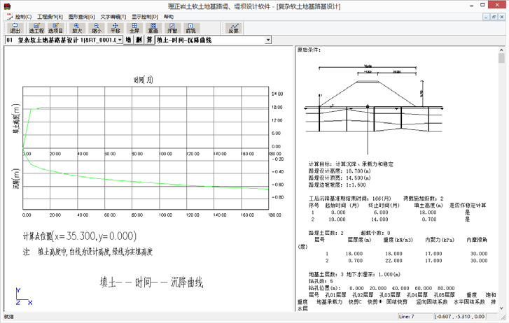 ■ 针对不同的地基处理措施(包括天然地基),考虑施工工况过程(多级加载),采用规范方法计算均质地基(单、双面排水)的平均固结度、采用太沙基一维固结理论(微分方程方法)计算单层、多层地基土的固结度;可准确地计算任一点、任意时刻的沉降,并可分析计算工程竣工时沉降、计算工后基准期内的残余沉降,为选择地基处理方案提供定量的数据指标。地基的最终沉降量可采用经验法(经验系数×主固结沉降)或公式法(瞬时沉降+主固结沉降+次固结沉降)计算;并且以直观的图形输出基础底面处路基竣工、工后基准期、最终沉降的沉降曲线,填土过程沉降(固结)曲线。