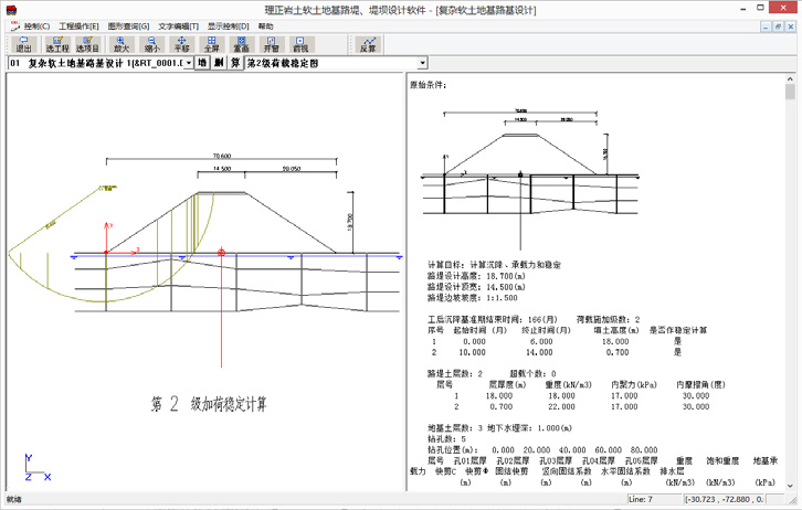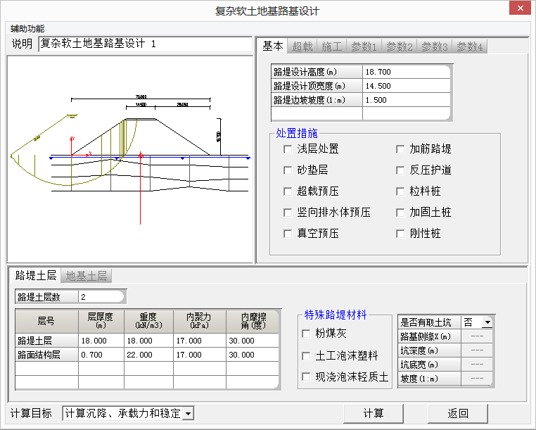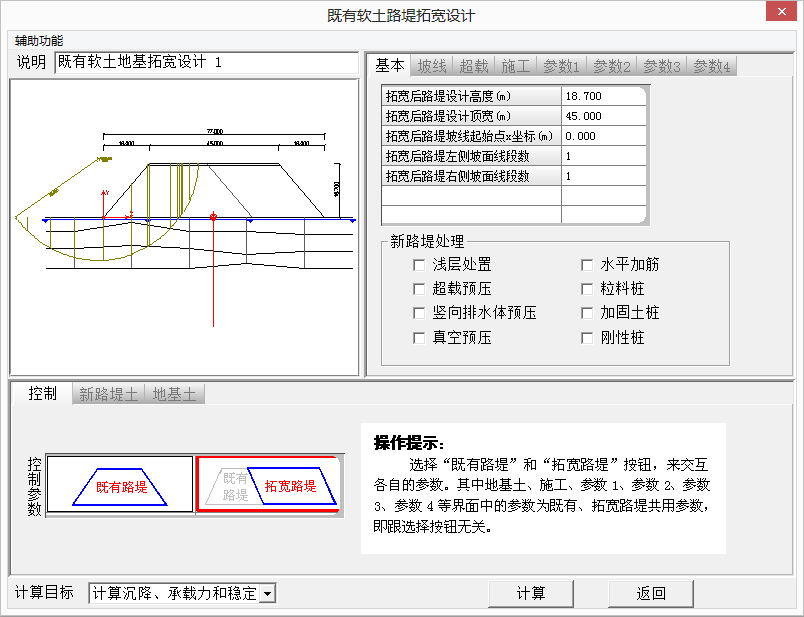 ■ 解决了新、老路堤(不同时间、不均匀填土)固结(不均匀)沉降计算、新老路堤整体协同稳定性验算的难题;既适应局部地基处理,也适应新、老路堤分别采用不同的地基处理措施(粒料桩、加固土桩、管桩、竖向排水体、真空预压);是既有路堤改、扩建设计计算必备的功能。