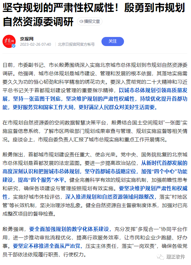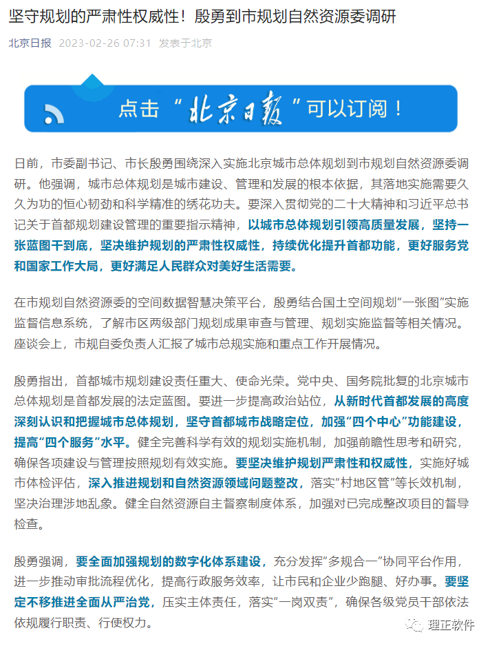 近期,《北京日报》发布《坚守规划的严肃性权威性!殷勇到市规划自然资源委调研》的专题报道,《北京日报》文中写到,市委副书记、市长殷勇围绕深入实施北京城市总体规划到市规划自然资源委调研。殷书记结合由国土空间规划“一张图”实施监督信息系统,了解市区两级部门规划成果审查与管理、规划实施监督等相关情况。
