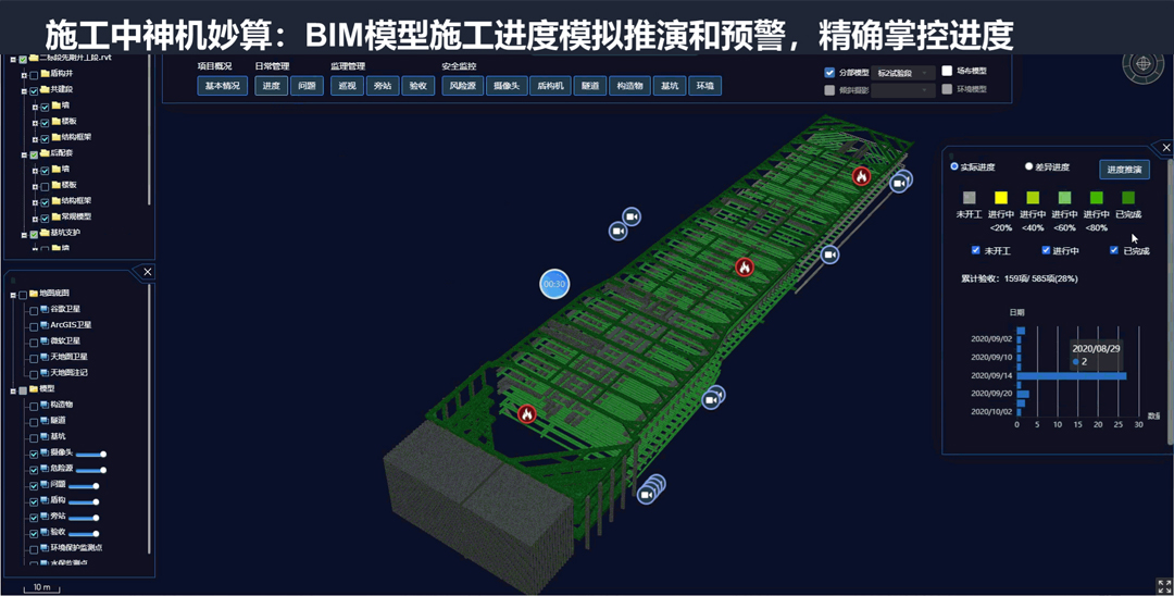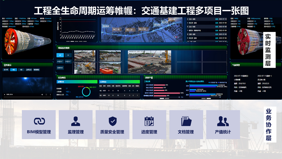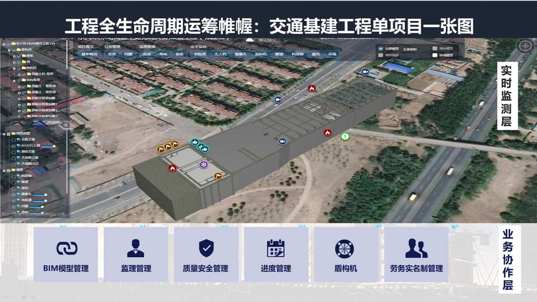 交通基建工程具有地质条件复杂、设计难度大、施工环境差、作业面多、工序转换复杂等特点,对设计水平以及施工技术和管理的要求较高,理正积极探索了GIS、BIM、AI、物联网、边缘计算等新技术和交通基建工程行业问题的结合点,从规划设计到施工运营全过程,通过BIM+GIS技术实现了多种应用:多项目/单项目一张图辅助全局运筹帷幄、BIM模型方案预演和模拟碰撞检查及管综调整有效优化设计、施工方案模拟推演和进度预警能精确掌控进度、模型构建编码体系两级嵌套准确计算进度产值、AI和边缘计算违规自动报警提供现场安全监管效率、基坑监测预警及时发现安全隐患等。通过BIM模型轻量化工具,实现BIM模型的Web端调用,保证随时、随地调取与分析数据,建设云服务提供了工程专属的跨组织跨层级协作平台,助工程全生命周期低碳工作。