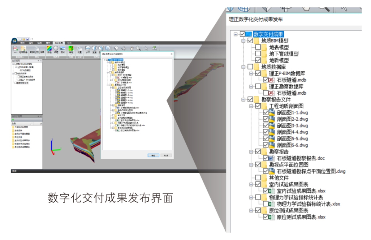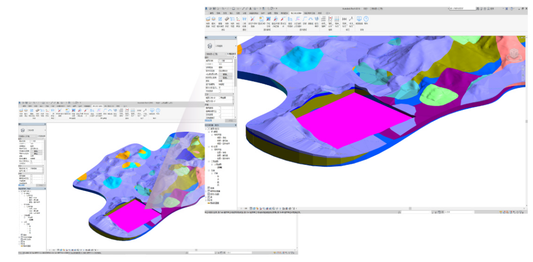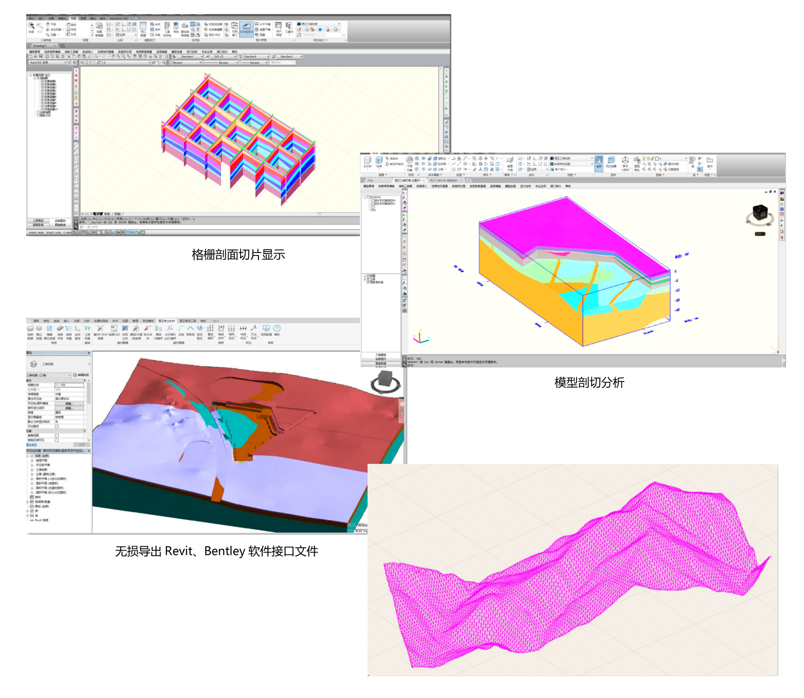 基于Revit、Bentley平台的辅助设计软件,可将三维地质模型导入,进行地层体、属性等查询;并对模型进行剖切、开挖,设计支挡结构等工作,对工程项目的BIM设计提供岩土环节的支持。