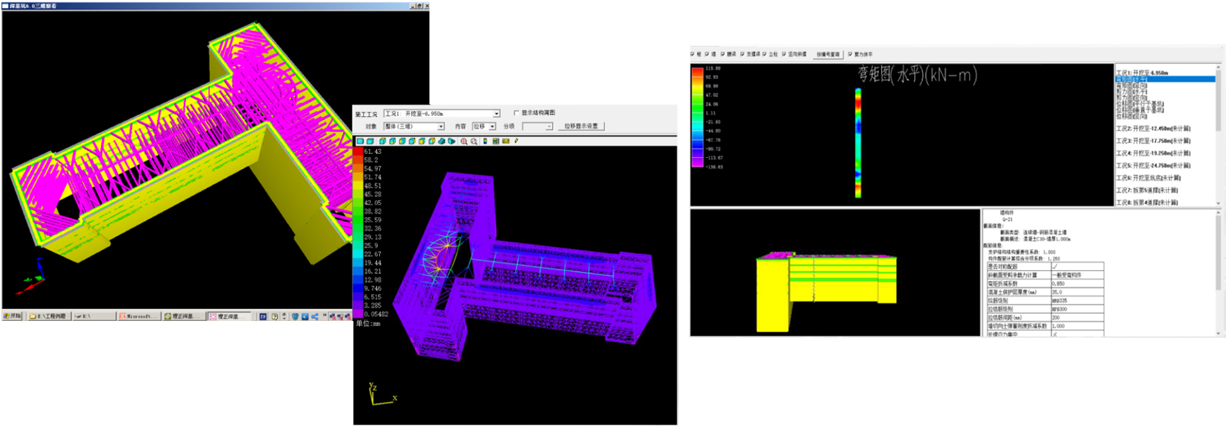 实现基坑真三维计算功能,可进行支护构件,内支撑、立柱、斜撑、锚杆及土岩体的三维空间整体协同计算,完成构件的位移、内力、配筋计算,具有三维动态图形显示、构件自动归并、工程量统计、施工图自动生成等先进功能。可支持《建筑基坑设计P-BIM软件功能与信息交换标准》T/CECS-CBIMU4-2017标准,支持读入勘察、基础P-BIM数据,并输出基坑P-BIM数据。