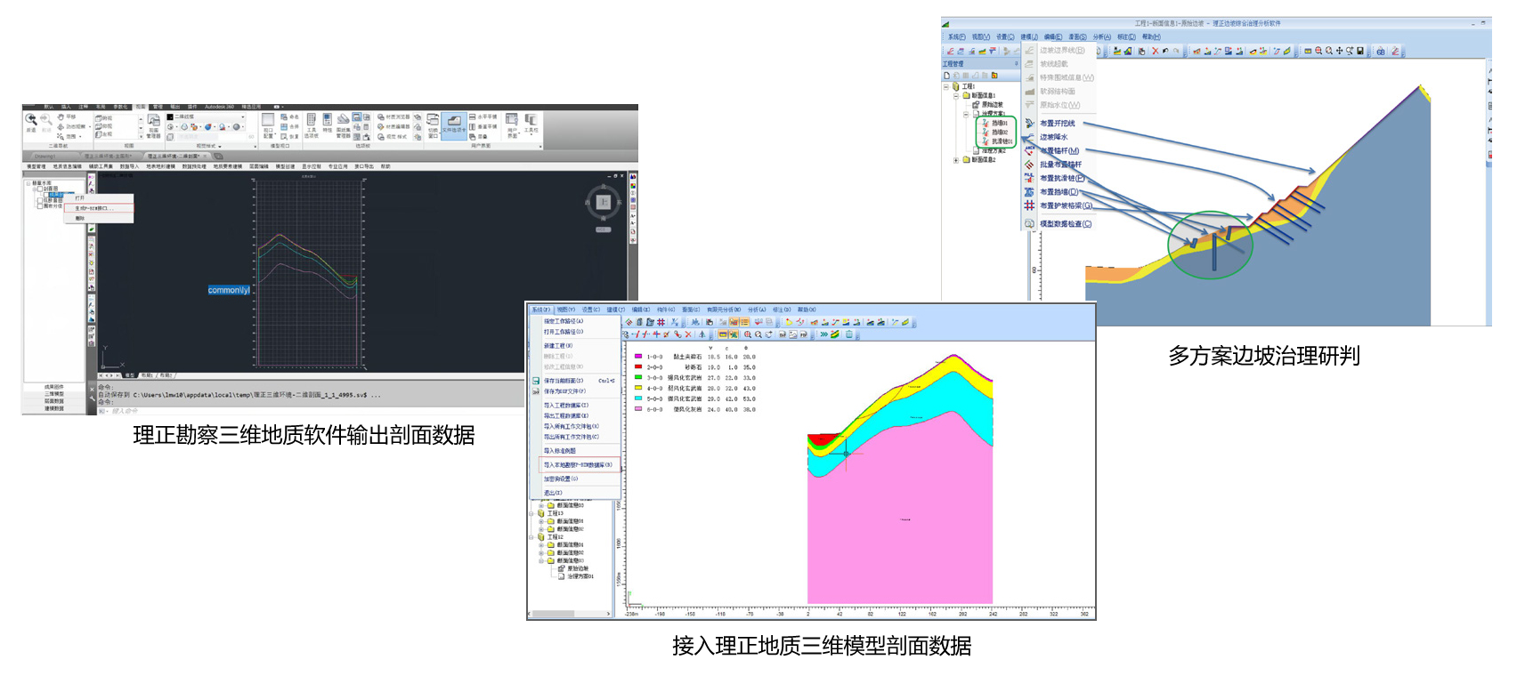理正勘察三维地质软件集三维地质模型创建、模型仿真展现、工程地质三维分析应用为一体的软件系统。根据钻孔、地质平面图、纵断面图、剖面图等多源数据创建生成包含多种地质要素的复杂三维工程地质模型。并可实现任意剖切;基坑、基桩、隧道、路堑刷坡等工程活动的模拟开挖;土方量估算等工作。可与工程地质勘察软件、基坑平面有限元分析软件、边坡综合治理软件进行数据互通。