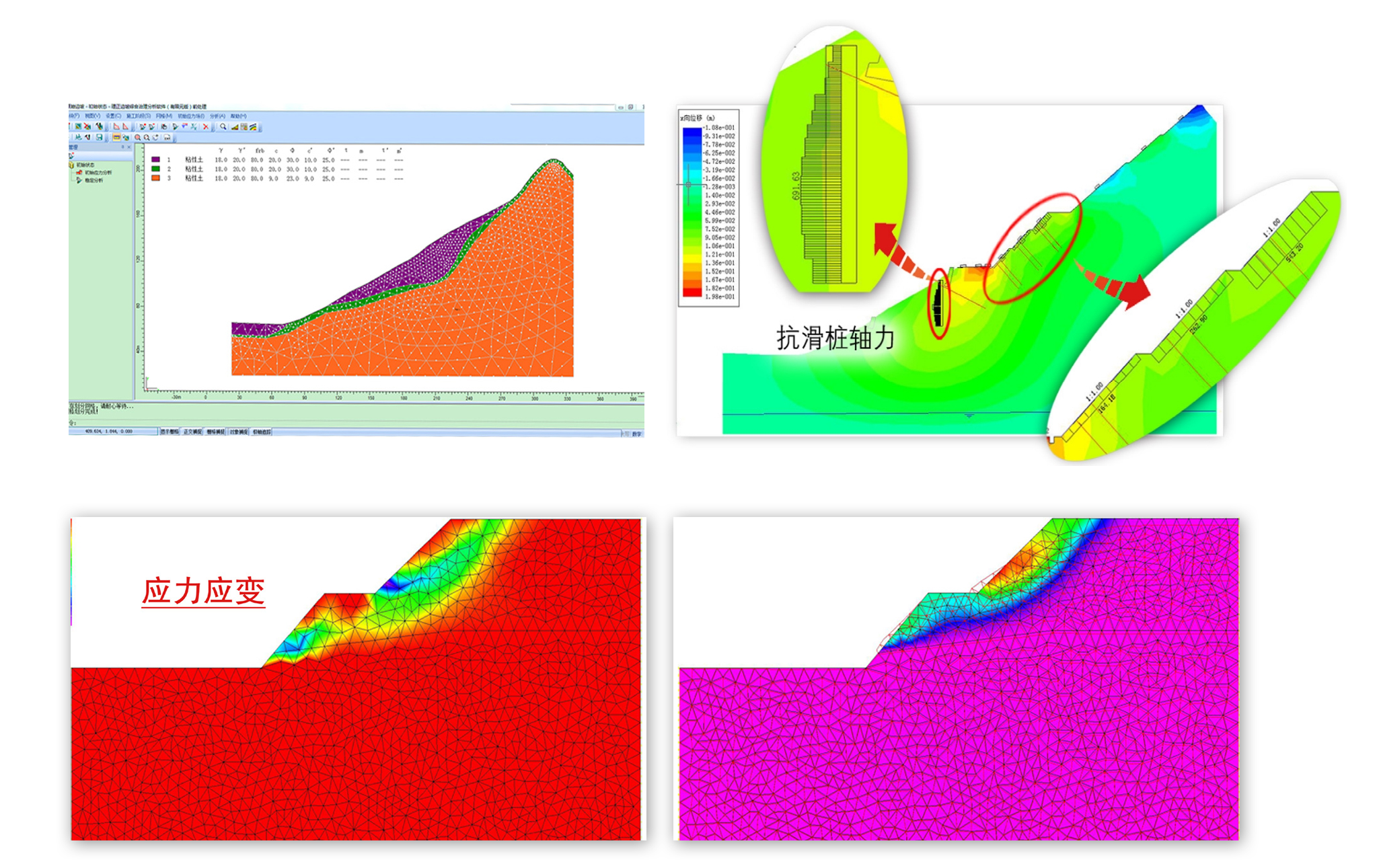 依托理正边坡综合治理软件已有边坡模型和治理模型,采用非线性有限单元技术对模型对象进行弹塑性分析,以及采用强度折减方法进行边坡稳定性分析。可以分析出边坡位移、应力应变及支护构件内力,并进行可视化查看。是传统规范方法的有效补充,同时也是国内较先具备P-BIM功能的边坡设计软件。