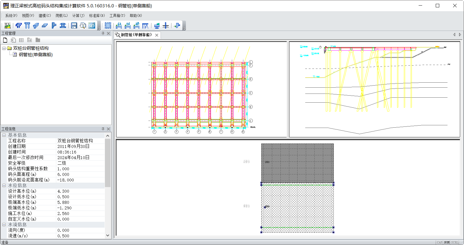 系统包括10余种码头结构设计时常用的计算工具,包括各种荷载计算,板、梁、桩、桩帽、靠船构件的内力及配筋计算;并且形成完整的计算书;