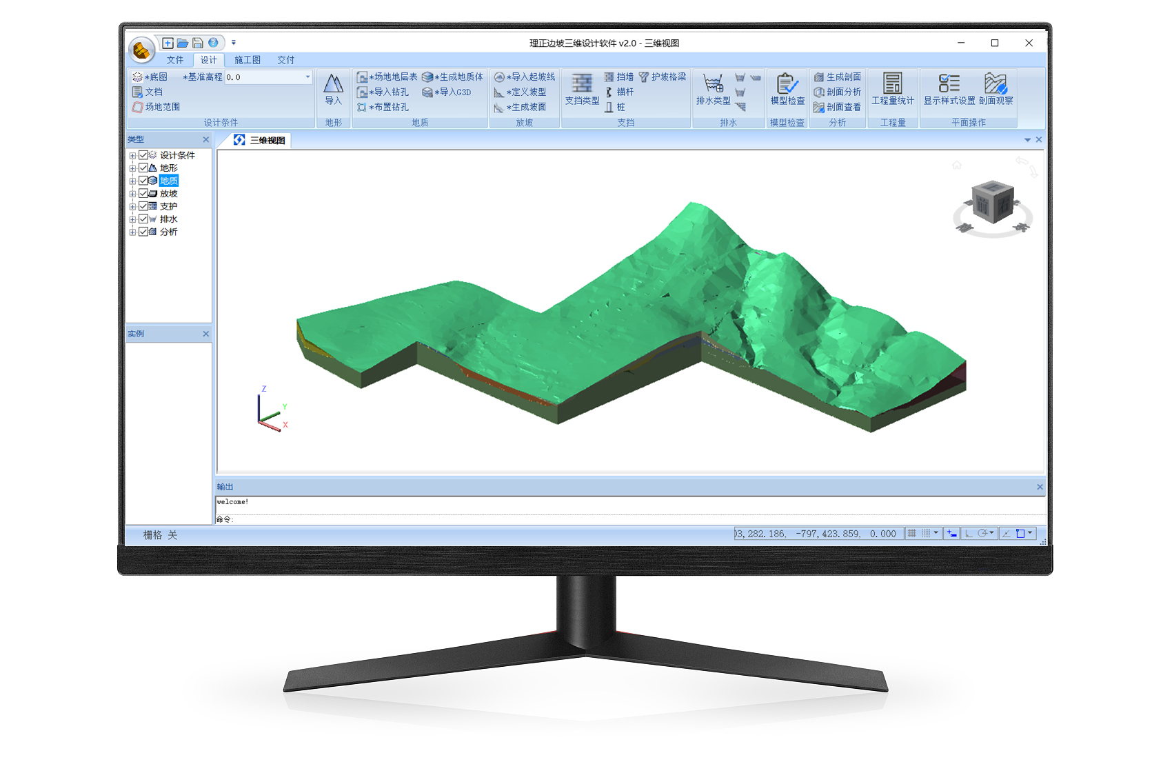 理正边坡三维设计软件是集三维地质、边坡设计、边坡分析、施工图、数字化交付于一体的设计软件,采用理正自主研发的国产图形平台,可以实现二、三维联动,以三维地质模型为基础,在三维空间上实现放坡、支护、排水等边坡全要素设计,边坡剖面可送入理正边坡综合治理分析软件进行边坡稳定性分析,可自动生成边坡施工图并进行工程量统计,设计成果支持数字化交付。