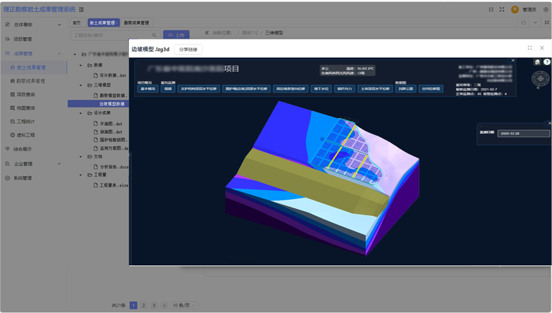 系统基于理正国产安可管理平台,不仅适配国产主流的基础软硬件、操作系统和数据库,完美融入信创环境,可提供勘察、岩土各类数据交换服务,实现数据共享与多人协作,利用岩土数据与GIS数据结合,项目人员实时访问和编辑边坡工程的三维模型、设计成果和工程量等关键资料,大幅提升了设计工作的协同性和效率。同时通过对工程项目集中存储和管理工程文档、报告、设计参数和案例研究,帮助团队成员可以快速捕捉和应用最佳实践,优化设计方案,提高工程质量,提升了边坡工程设计的协同效率,还强化了知识的积累和再利用。
