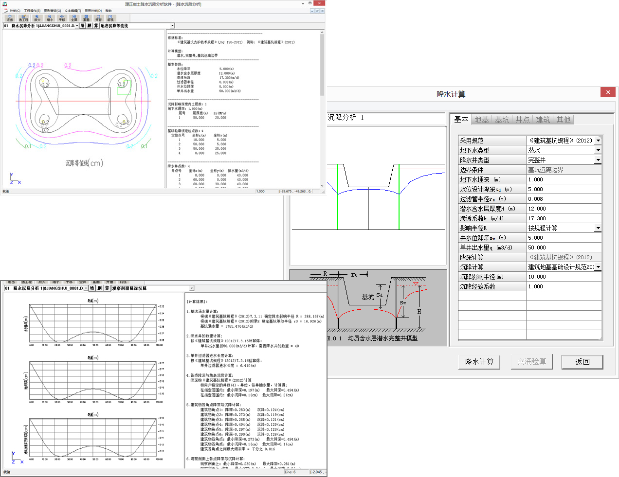 ★输出井点布置图、各点降深及沉降简图、降深及沉降等值线、相邻建筑物角点沉降值、倾斜沉降值、任意剖面的降深、沉降曲线以及完整的计算书。
