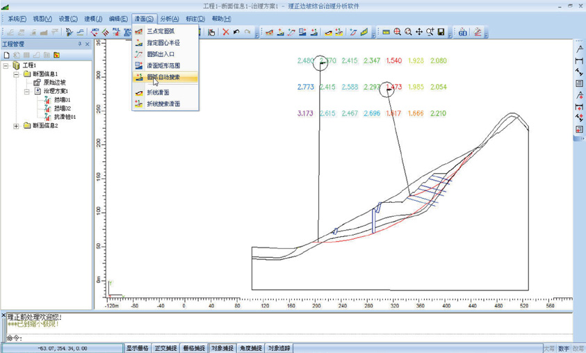 2. ■ 治理方案设置:一个断面可设置若干治理方案。每种治理方案均可独立设置填方、挖方、挡墙、抗滑桩、护坡格梁、锚杆锚索等治理措施及其组合;均可对每种方案进行稳定计算及结果展示。方便方案比选。极大方便设计人员,提高设计效率。