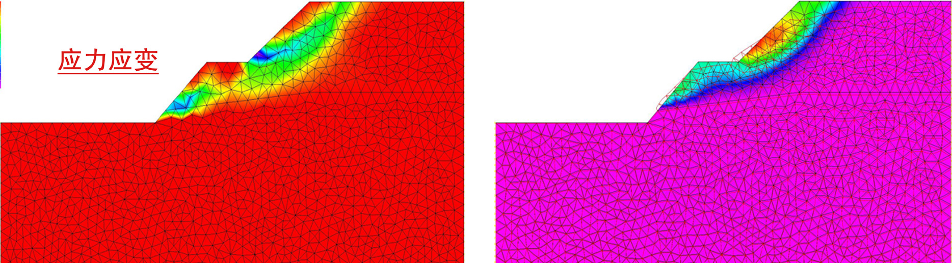 ■ 采用强度折减法进行整体稳定性分析,可以直接分析出可能滑动面及安全系数,方便与传统条分法相互印证,避免遗漏不利滑动面。