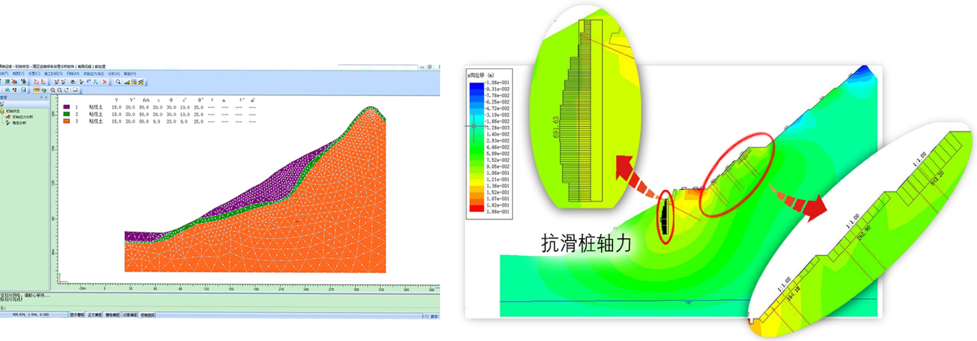 ■ 采用弹塑性分析方法,可以分析边坡在开挖、回填、支护等施工过程中应力位移变化过程和稳定性,可以分析支护结构的内力、位移。
