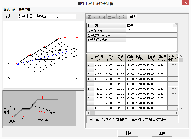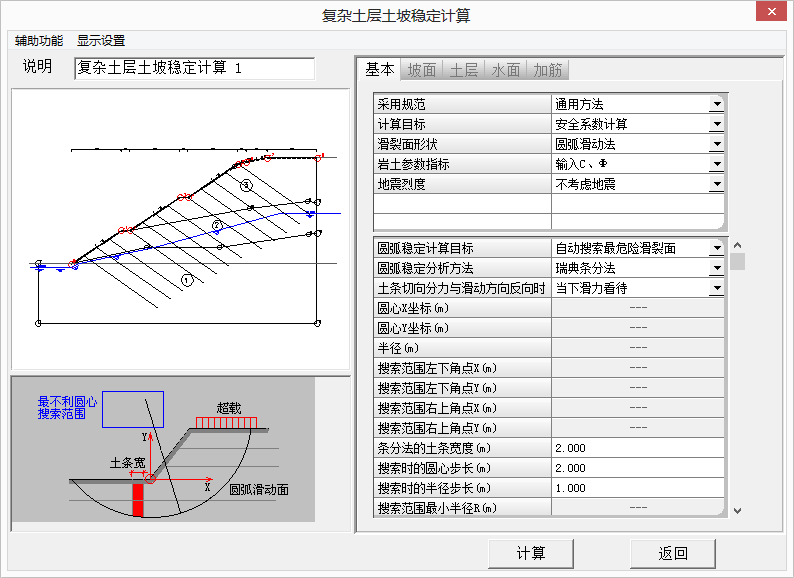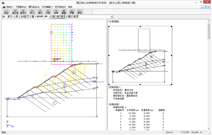 •从每个土条到整个土坡的自重、水浮力、渗水压力、地震力、附加力、下滑力、抗滑力等一系列详尽的计算结果。