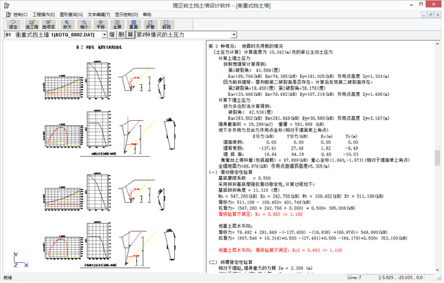 挡土墙计算难在确定土压力。本软件采用的库伦土压力理论,准确求 出土压力的大小、方向、作用点;第一和第二破裂面;地震荷载及水压力参与计算;衡重式挡土墙的上墙、下墙分两步进行计算(下墙用“力多边形法”或“等效超载法”计算土压力)。对重力式、半重力式、垂直预应力式、悬臂式、扶壁式、桩板式、锚杆式和锚定板式挡墙,除库仑土压 力计算方法外,增加了朗肯土压力和静止土压力的计算方法; 提供“验算”、“设计”两大功能,其中“设计”重力式、衡重式等挡土墙时自动输出优化截面,智能化程度相当高。