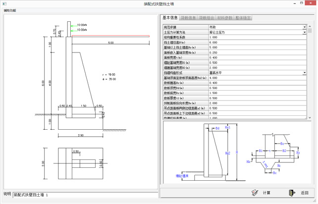 ★扶壁式挡土墙整体验算、结构内力计算,面板、肋板、基础的内力、配筋、裂缝及变形计算、面板+肋板与基础的连接计算和吊装计算。