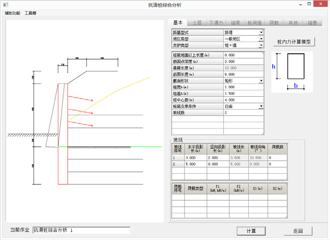 ■计算时可选择m法、C法、K法。桩顶可设置锚索,底端边界条件可选择自由、铰接、嵌固三种;滑坡推力有矩形、三角形、梯形等几种;桩身截面可取圆形或方形,配筋按均匀或非均匀布置。