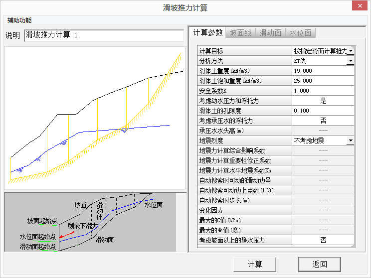 ■给定滑动面,计算滑坡推力。可考虑地下水浮力、地震力、承压地下水浮托力、动水压力,还可由用户任意添加两个方向的附加力;适用于牵引式、推动式等各种形式的滑坡体。