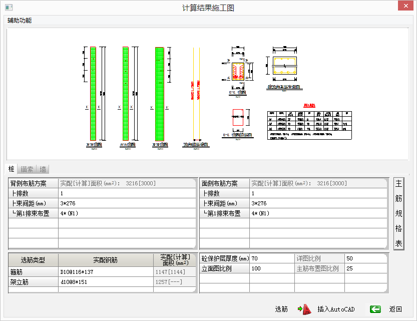 ■设计计算与施工图绘制一体化,可自动输出桩、锚索、桩间墙、桩间板及锚头的施工图;