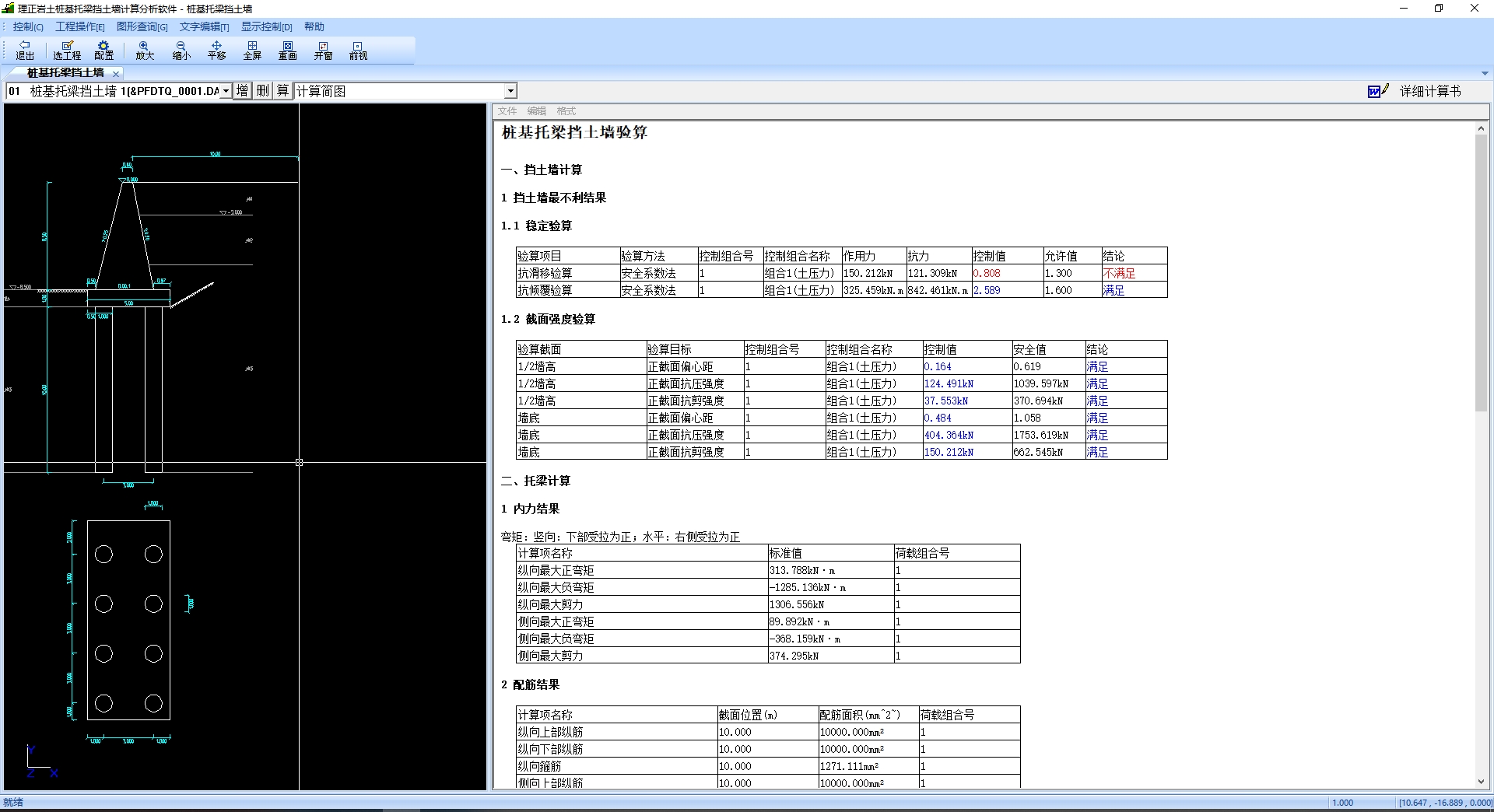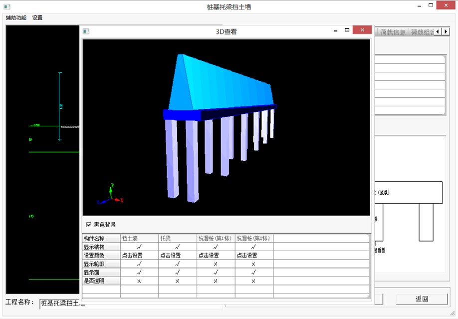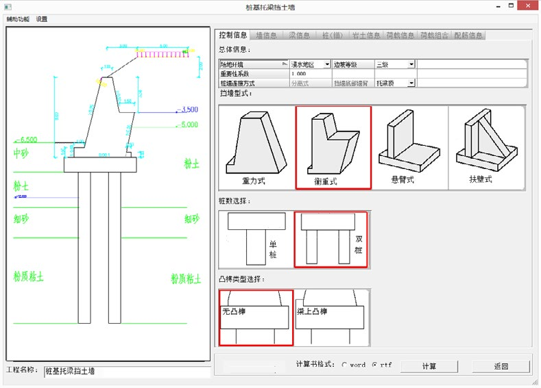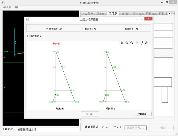 桩基托梁挡土墙是由上部挡土墙、中部承台(托梁)及下部桩基组成的一款组合型支挡结构,在高边坡或软土地区边坡支护里应用广泛。本软件是首个集挡土墙、托梁、桩为一体的整体分析计算软件,主要依据现行最新设计规范,可计算复杂坡线,多种超载形式的土压力;可分别进行土压力控制或滑坡推力控制两种模式下的桩基托梁设计;可完成挡土墙抗滑移稳定性验算,抗倾覆稳定性验算,截面强度验算;承台正截面及斜截面承载力验算;桩内力及配筋计算。建模简单,计算快速,设计内容全面,可实现多个组合计算及最不利组合的比选,最终输出图文并茂的计算书。
