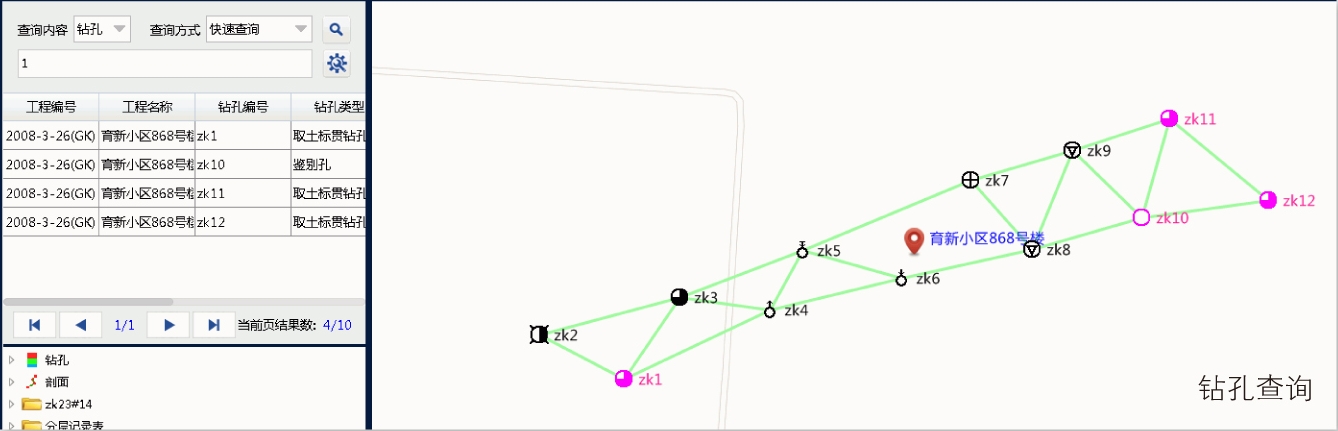 2. 系统提供了多种数据查询和统计方式:可根据工程编号、工程名称、施工日期等进行工程查询,根据钻孔编号、钻孔类型、孔口高程等进行钻孔查询,根据存档日期、制作人等进行文档查询,同时可实现多个工程间钻孔数据的空间查询和定位,并可实现沿某条线路两边一定范围内(缓冲区)的钻孔数据查询,具有良好的工程实用性。