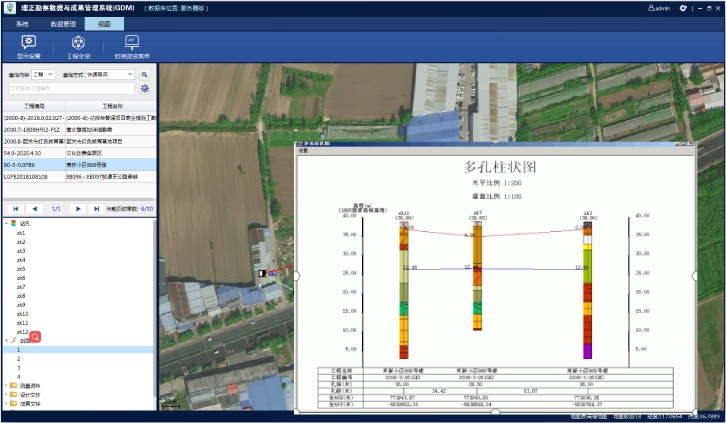 该系统专门为勘察单位提供的一套工程数据和图文档综合管理的解决方案,该系统通过与理正工程地质勘察CAD无缝联接,大大提高了建库效率;可单独管理勘察数据与图件,也可以将勘察数据与地图相结合,实现对大量的工程勘察资料综合管理;利用网络地图的方式,形象地展示工程位置和钻孔分布;提供多种便捷数据查询和统计方式;生成单孔柱状图、多孔柱状图、剖面图等多种成果图表。