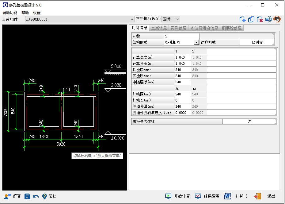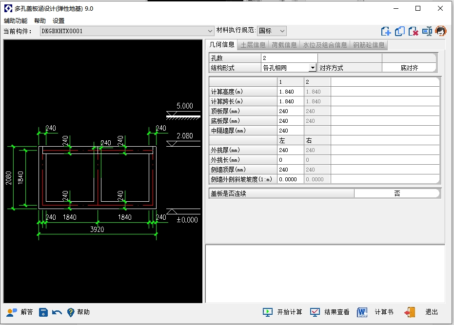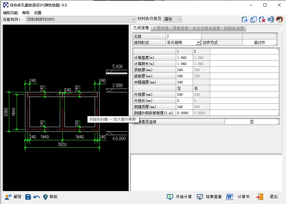 通道涵、多层、软基、结构对称/非对称、荷载对称/非对称、地基承载/抗浮验算、内力/配筋/裂缝计算。