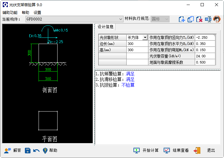 该模块是一款专为光伏支架墩设计而开发的基础计算工具。该软件依据行业规范,主要针对光伏支架基础的稳定性进行验算,包括抗倾覆验算、抗滑移验算、抗拔验算,以满足光伏支架在不同工程条件下的稳定性。