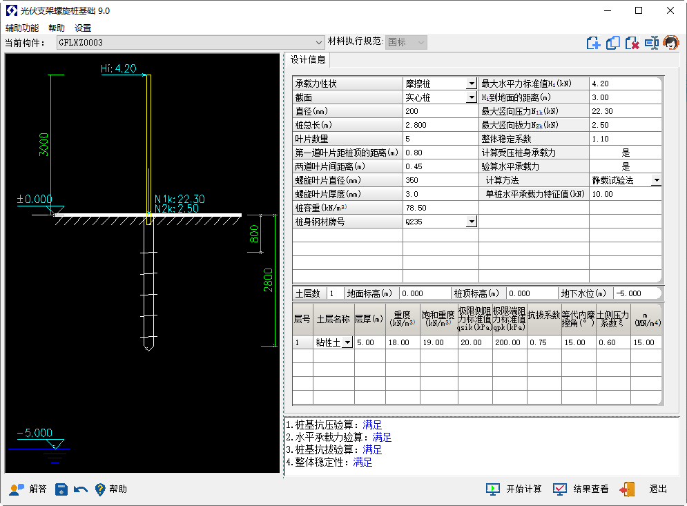 该模块主要针对光伏支架螺旋桩基础承载力与稳定性的验算,包括:竖向抗压承载力验算、竖向抗拔承载力验算、水平承载力验算以及整体稳定性验算。