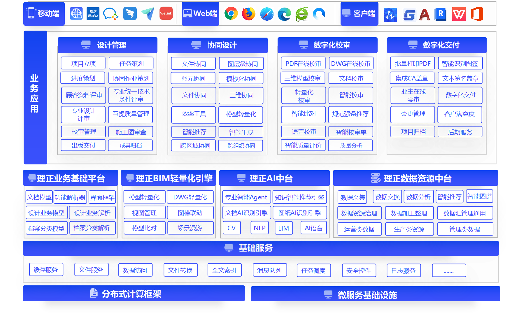 人工智能(AI)增强型二三维协同设计系统是由北京理正自主研发,系统AI智能应用是基于第三代管理平台、AI应用平台、BIM轻量化平台、CAD开发平台、移动应用平台构成的系统应用,通过人工智能AI专项应用(设计场景智能感知与提醒推送技术、工程图纸图元智能识别技术、全方位的设计成果版本差异比对技术、设计成果智能签署技术)、智能专业语音助手技术、打造了一个AI加持的数字化协同设计系统,助力设计企业从二维设计到三维正向设计的平稳过渡,实现设计全过程数智化管理。