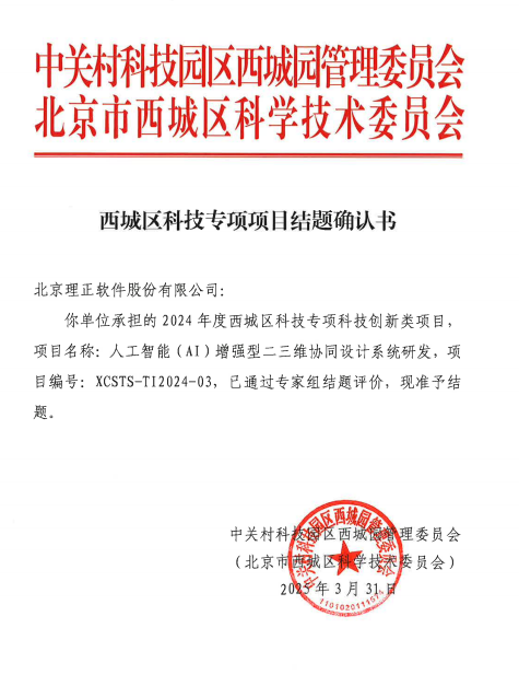 近日,由北京理正软件股份有限公司承担的2024年度西城区科技专项科技创新类项目“人工智能(AI)增强型二三维协同设计系统研发”,项目编号XCSTS-TI2024-03,成功通过北京市西城区科学技术委员会组织的专家组结题验收!