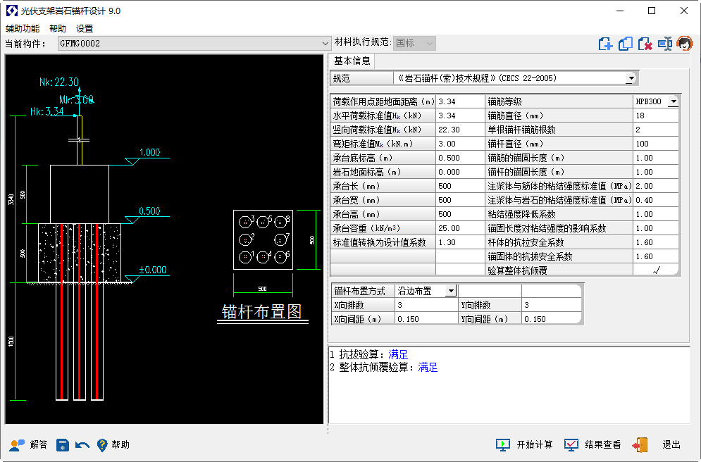 该模块旨在为光伏支架的岩石锚杆基础设计提供高效计算和工具。通过参数化计算,用户能够高效地完成单根锚杆抗拔验算、整体抗倾覆验算,确保光伏支架岩石锚杆基础的稳定性和安全性。