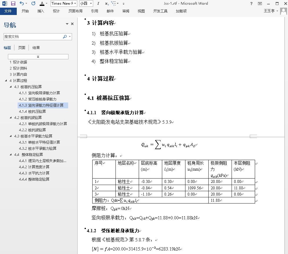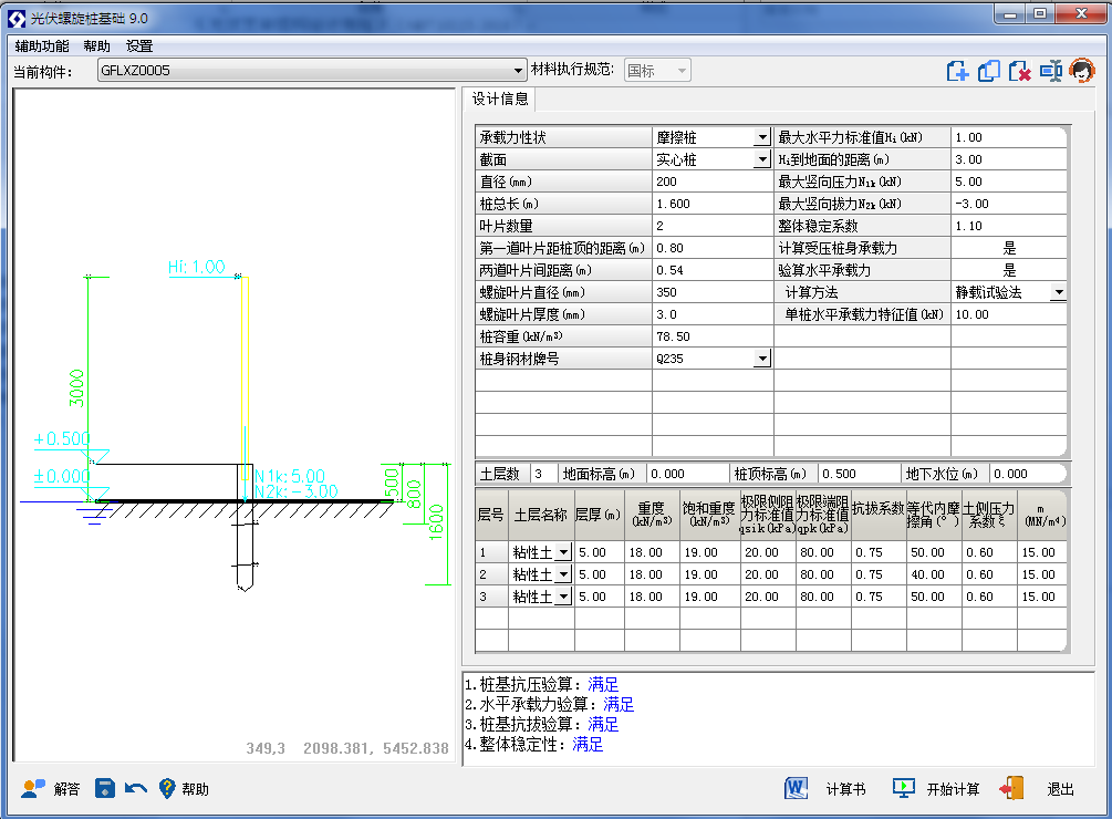 该模块主要针对光伏支架螺旋桩基础承载力与稳定性的验算,包括:竖向抗压承载力验算、竖向抗拔承载力验算、水平承载力验算以及整体稳定性验算。
